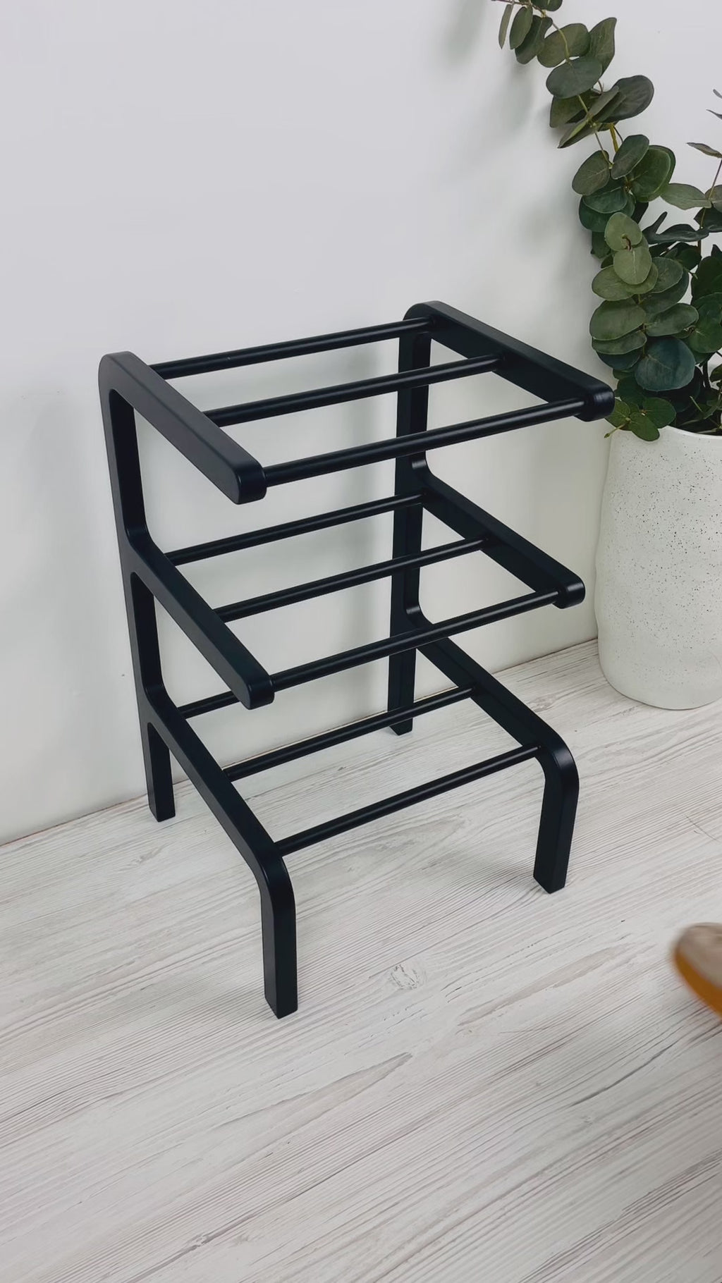 Незважаючи на мінімалістичні розміри, конструкція дозволяє зручно розмістити 3 пари взуття. Кожна пара отримує свій окремий рівень, що забезпечує швидкий доступ та відмінну вентиляцію. Вертикальне розташування ярусів сприяє швидкому висиханню взуття після вулиці. Повністю чорне виконання робить виріб практично непомітним в інтер'єрі або, навпаки, стильним графічним акцентом на фоні світлих стін.